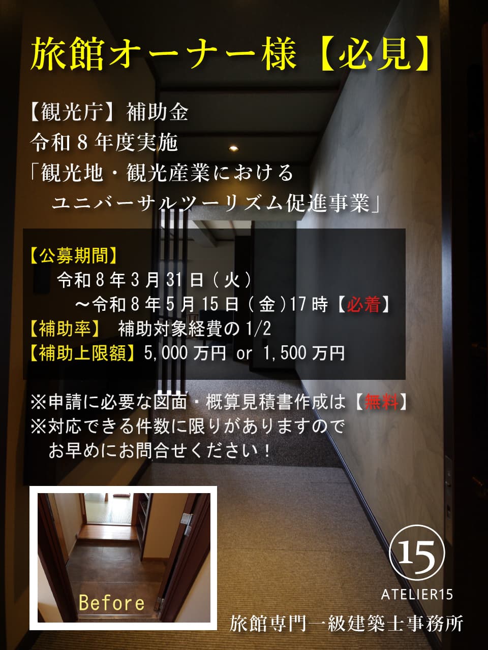 ”旅館リノベーションの知識と経験が豊富な一級建築士”が、オーナー様の『お困り』『お悩み』『不安』を《解消・解決》致します!
